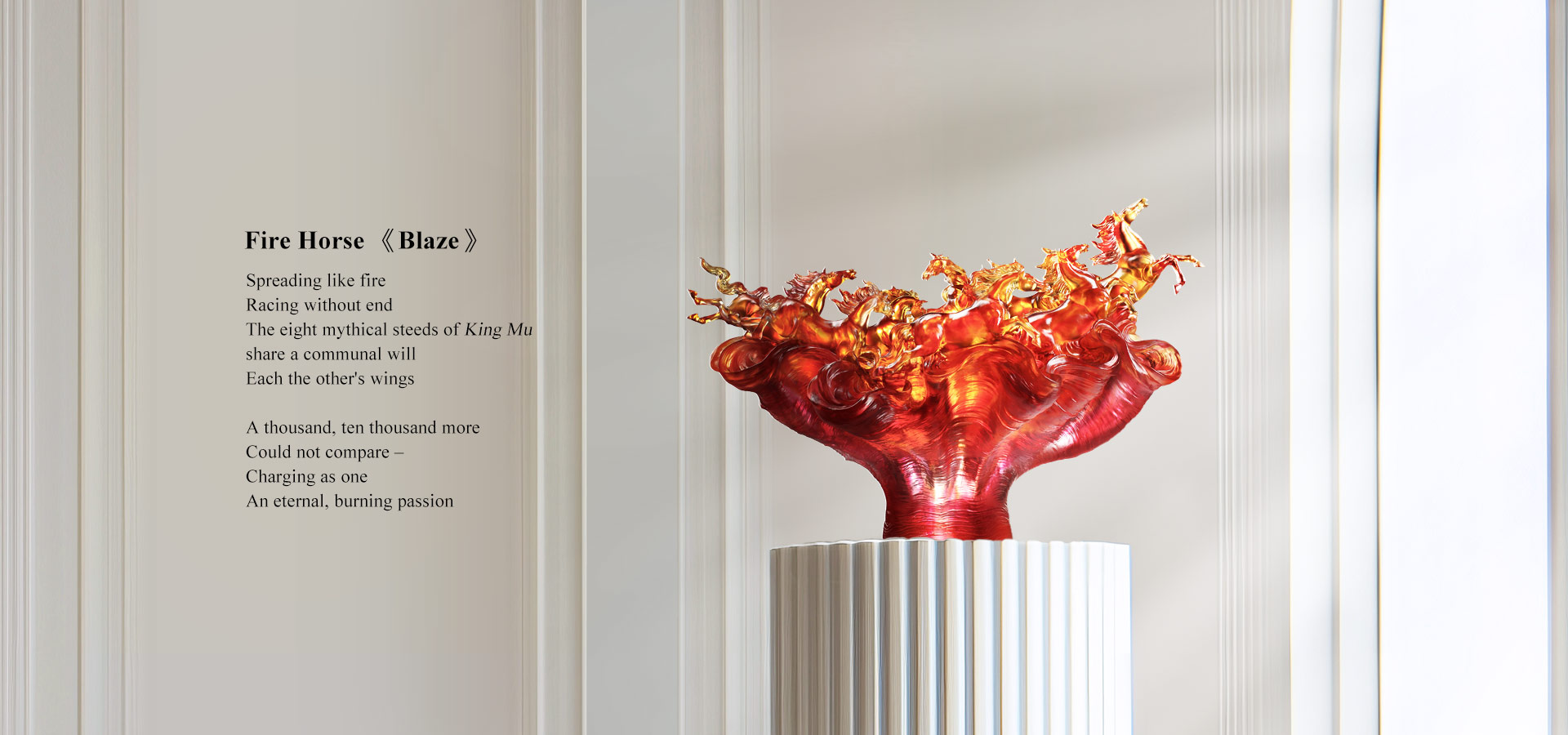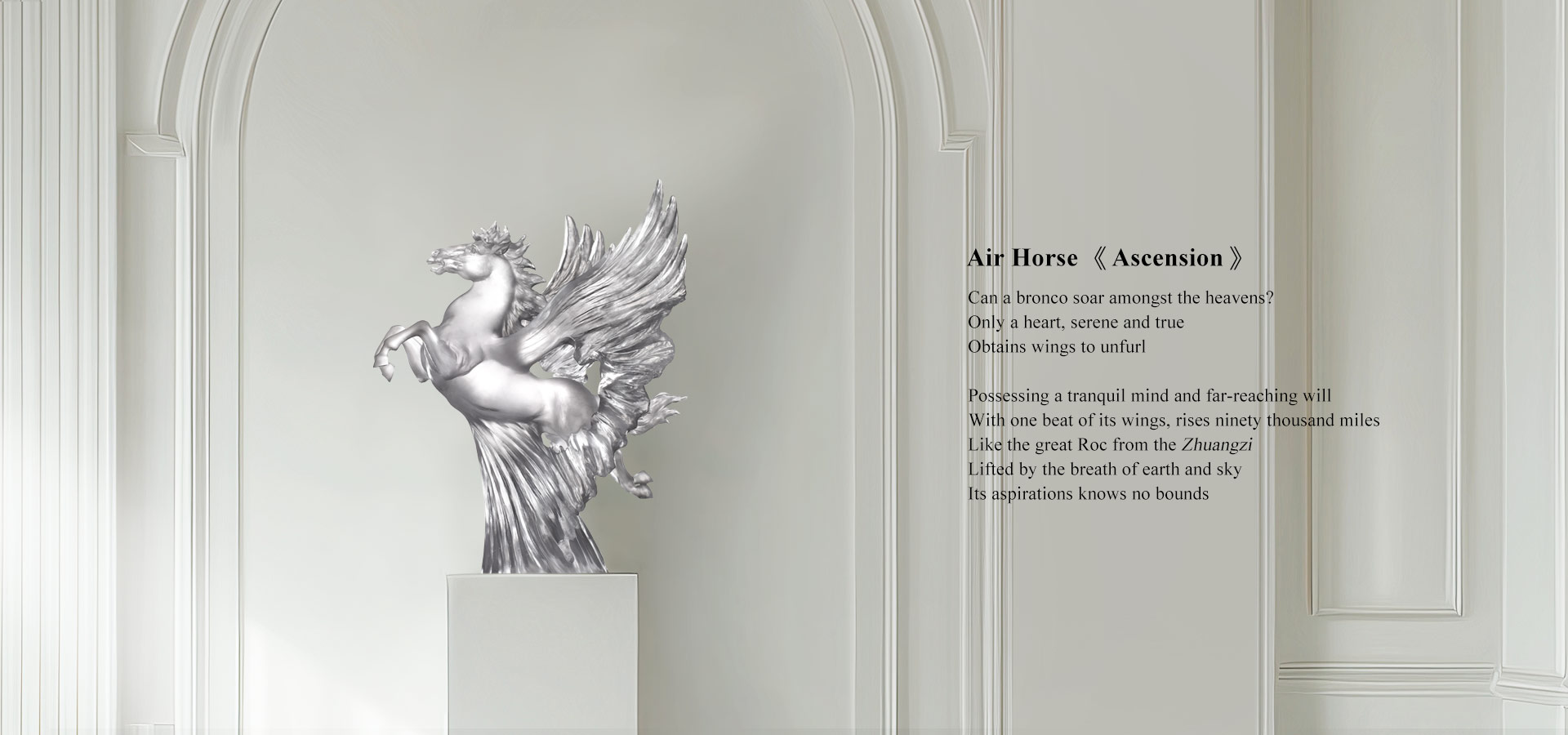 wind, fire, earth, and qi — became the rhythm of the universe. When they encountered the horse, each found a new expression, becoming a symbol of our inner drive to transcend. Beneath the shifting light of liuli, the form of life itself seems to gallop and flow through space.